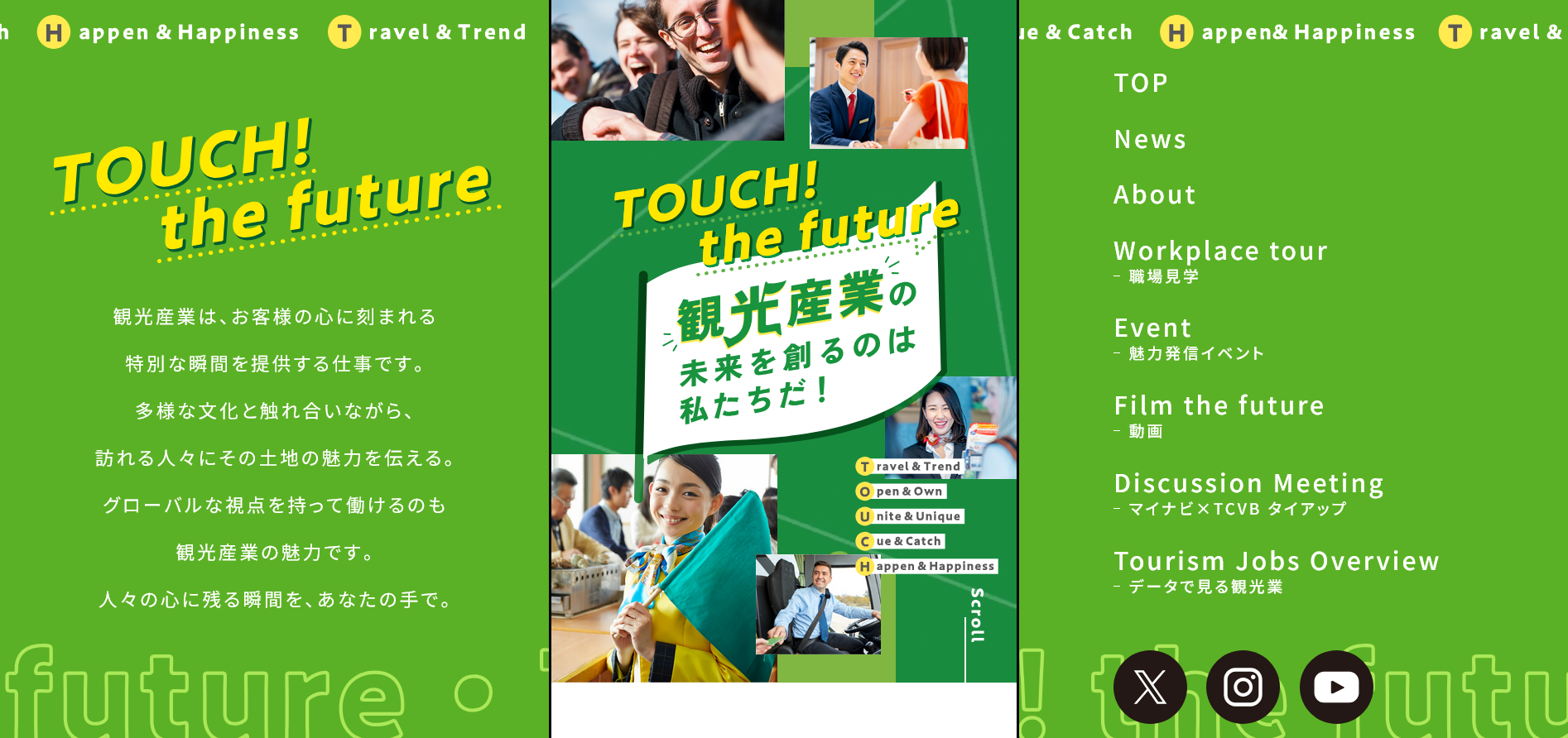 若者の多くはスマホで情報収集をしていることを考慮し、スマホ特化型サイトを構築。コンテンツとしては、観光産業をよく知ることができるインフォグラフィックス、マイナビタイアップの座談会、実際の職場を見学できる職場見学会、様々な観光産業に従事している方のヒトコト楽しさボード、観光産業で働く方のキャリアパス、展示会出展などを掲載。様々なコンテンツを通して観光産業の魅力を感じて貰い観光産業への就業意欲を醸成。