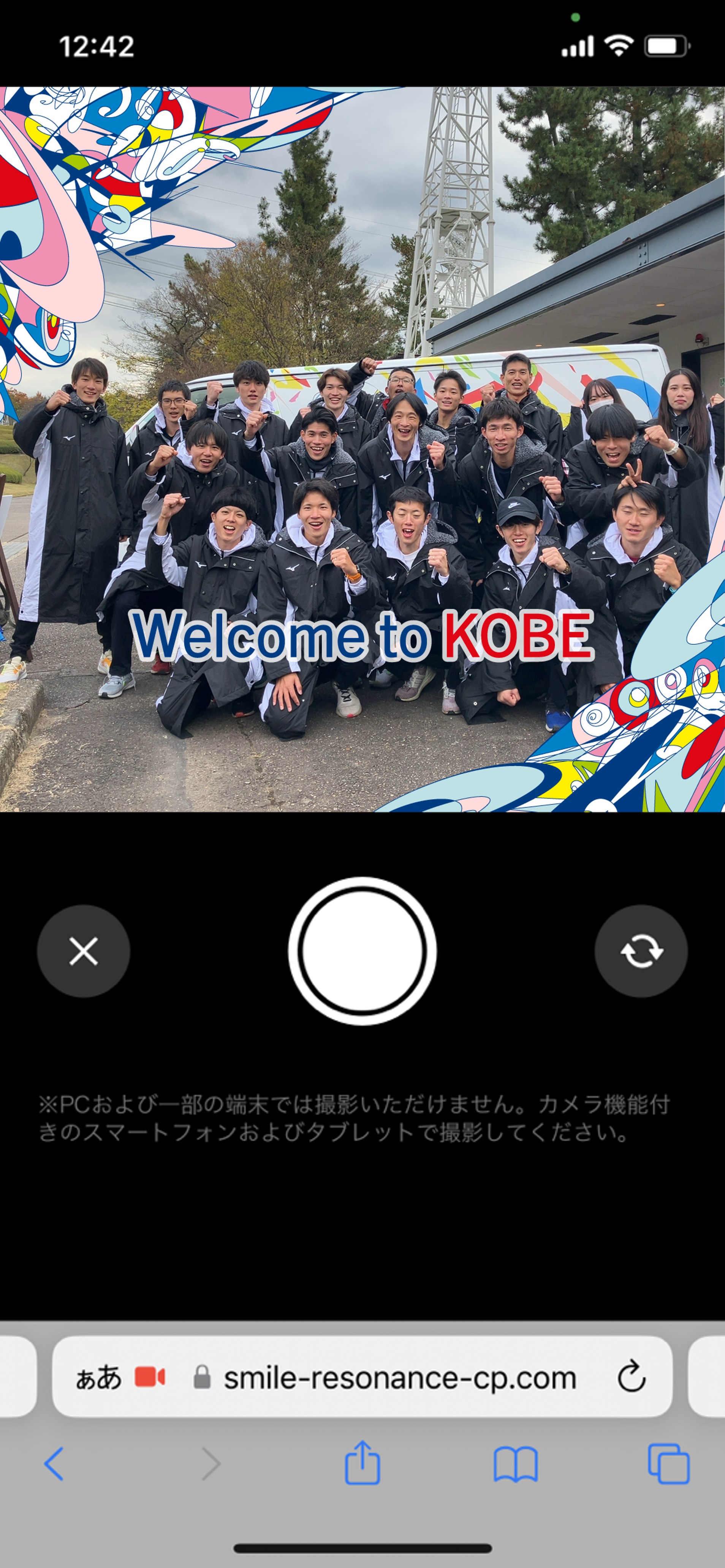 大会を盛り上げるべく、大会200日前から全国の関係施設をキャラバンする企画を実施。キャラバンの現場に撮影ブースを設けブラインドカメラマンによる撮影を実施。加えて、オンラインでも参加できるよう、オン/オフライン共通で使えるカメラシステムを構築したいが予算の都合上、スマホのネイティブアプリの構築は難しい。